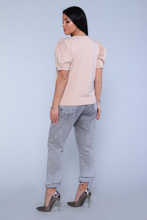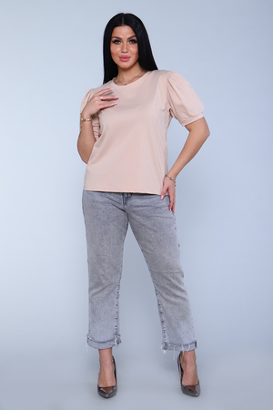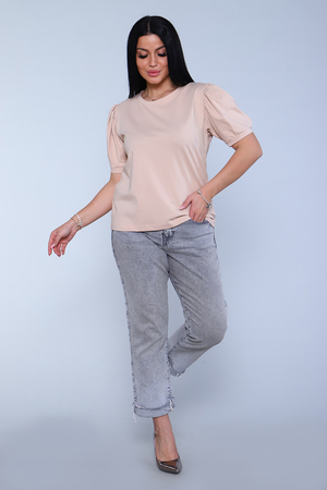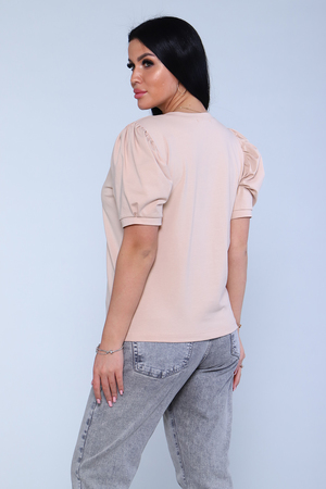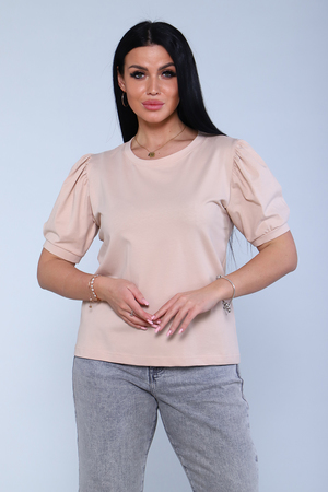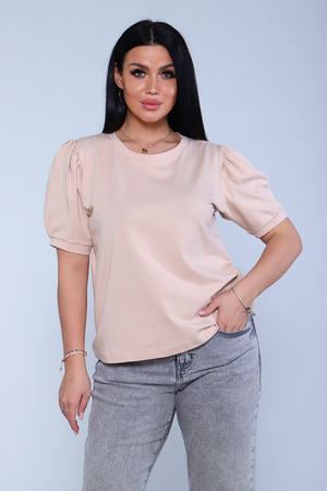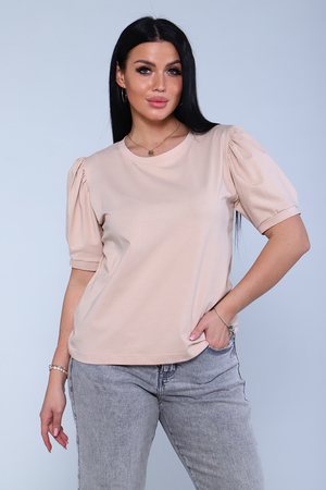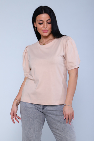 Женская футболка состоит из ткани высшего качества-пенье. Представлена в двух нежных и модных расцветках белый и бежевый. Футболка прямого кроя имеет круглый вырез горловины с планкой. Футболка средней длины не сковывает движений. Актуальный рукав фонарик со сборкой отвечает основным тенденциям моды.