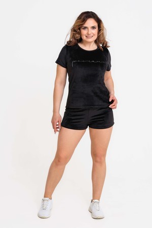 Костюм женский из велюра. В комплект входят: футболка с коротким рукавом с округлым вырезом горловины и шорты прямого покроя с широким поясом на резинке. Мягкий трикотажный комплект для женщин Российского производства. Стильный костюм из стрейч - велюра для женщин представлен в широкой размерной сетке: от маленького 42 размера до 52 размера. Удобный домашний велюровый комплект не сковывает движений, что делает его универсальной одеждой, которая подойдет на любую фигуру как для худеньких, стройных, так и для пышных девушек и женщин. Костюм двойка женский подходит на любой рост: для высоких и для невысоких. Однотонный костюм с шортами выполнен в спокойных и практичных темных тонах. Бархатный комплект из трикотажной ткани не сковывает движения, скрывает недостатки и подчеркивает достоинства фигуры. Классические прямые шорты без манжета, имеют комфортную посадку. Эластичная резинка на шортах не давит, не перетягивает талию, не скручивается. Текстильный костюм из велюра не мнется, не дает усадку после стирок, не теряет цвет, сохраняет форму и внешний вид. Молодежный комплект подходит для девочек, подростков, молодых женщин, а также для женщин любого возраста, желающих модно выглядеть в домашней обстановке. Легкий летний спортивный костюм позволяет коже дышать за счет хорошей воздухопроницаемости, а гипоаллергенная ткань высокого качества долго не потеряет своих характеристик. Шорты и футболку по Вашему желанию по отдельности можно комбинировать с другими предметами одежды. Костюм отлично зарекомендовал себя в эксплуатации, он будет долго радовать Вас при условии соблюдения рекомендаций по уходу за изделием. Тонкий повседневный набор дополнит Ваш домашний гардероб и будет комфортной альтернативой домашнему платью, халату, туники. Размер на модели 48, параметры 105-86-98/169.
