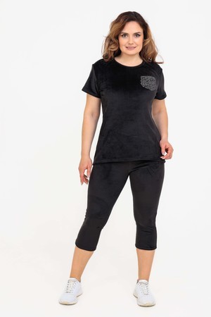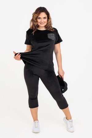 Костюм женский из велюра. В комплект входят:- футболка с коротким рукавом с округлым вырезом горловины и леггинсы. Мягкий трикотажный комплект для женщин Российского производства. Стильный костюм из стрейч - велюра для женщин представлен в широкой размерной сетке: от маленького 42 размера до 52 размера. Удобный домашний велюровый комплект не сковывает движений, что делает его универсальной одеждой, которая подойдет на любую фигуру как для худеньких, стройных, так и для пышных девушек и женщин. Костюм двойка женский подходит на любой рост: для высоких и для невысоких. Однотонный костюм с шортами выполнен в спокойных и практичных темных тонах. Бархатный комплект из трикотажной ткани не сковывает движения, скрывает недостатки и подчеркивает достоинства фигуры. Костюм из велюра не мнется, не дает усадку после стирок, не теряет цвет, сохраняет форму и внешний вид. Молодежный комплект подходит для девочек, подростков, молодых женщин, а также для женщин любого возраста, желающих модно выглядеть в домашней обстановке. Легкий летний спортивный костюм позволяет коже дышать за счет хорошей воздухопроницаемости, а гипоаллергенная ткань высокого качества долго не потеряет своих характеристик. Леггинсы и футболку по Вашему желанию по отдельности можно комбинировать с другими предметами одежды. Костюм отлично зарекомендовал себя в эксплуатации, он будет долго радовать Вас при условии соблюдения рекомендаций по уходу за изделием. Размер на модели 48, параметры 105-86-98/169.
