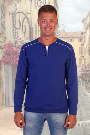 Мужской джемпер из футера с лайкрой двухнитки. Окантованная горловина необычного покроя с подкладкой и декоративными пуговицами, по низу и на рукавах манжеты, несколько расцветок.