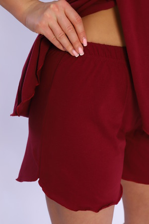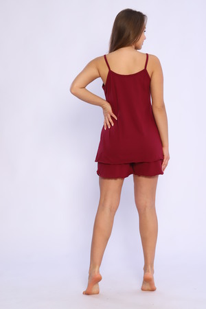 Пижама состоит из майки и шорт. Майка на бретелях, лиф с вытачками. Нижняя часть ассиметрична на запах. Шорты на притачной резинке, расширены к низу.