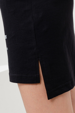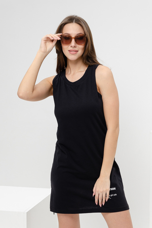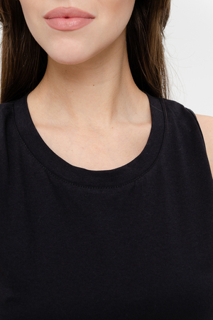 Туника полуприлегающего силуэта, с округлой горловиной, длиной выше колена, без рукавов, с разрезами в нижней части боковых швов. Спинка удлиненная. Горловина обработана обтачкой из основного полотна.