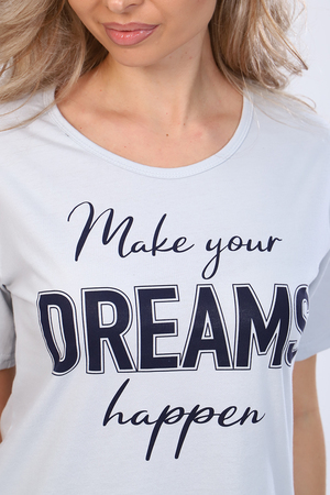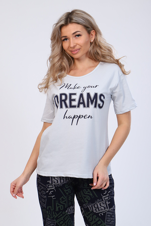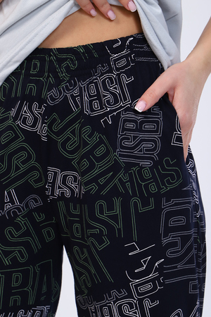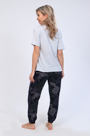 Костюм состоит из футболки и брюк. Футболка с короткими рукавами и принтом. Брюки с карманами, низ собран на резинку. Неотъемлемый элемент домашнего гардероба.