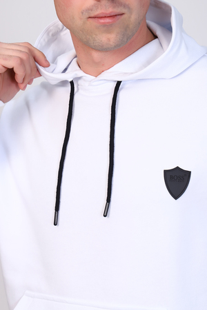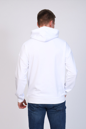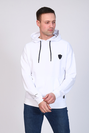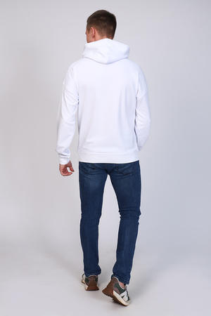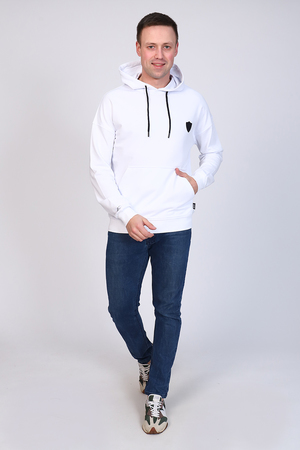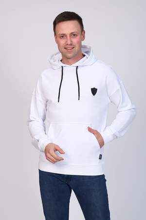 Толстовка мужская изготовлена из качественного футера трехнитки без начеса. Материал не линяет, не вытягивается, не скатывается в процессе использования изделия. Толстовка классическая с капюшоном и карманом-кенгуру. На груди расположена небольшая нашивка, на рукаве - вышивка. Рукава на манжете.