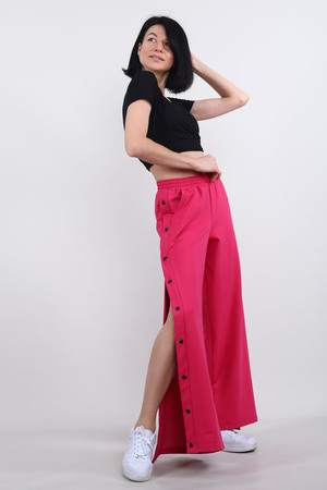 Брюки женские с кнопками по бокам. Данная модель выполнена из трикотажного полотна футер 2-х нитка с лайкрой, высокого качество "пенье". По бокам присутствуют карманы. Пояс отшит на поясной машине с резинкой 4 см. Отлично подходит для прогулок и для повседневной носки. К ним прилагается подарок в виде смайлика.