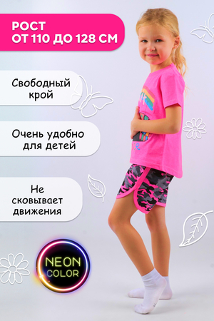 Трикотажный костюм отлично подойдет  для детей. Комплект удобен для прогулки на летнюю погоду, а также для дома. Этот ультра ЯРКИЙ  костюм можно дополнить классными кедами. Костюм также может подойти как форма для занятий спортом. Комплект имеет удобный свободный крой. Костюм выполнен из 100% хлопка (кулирка). Шорты без карманов и имеют широкую, вшитую, эластичную резинку. У футболки удобная длина рукава, который зачищает плечи от ультрафиолета. Костюм двойка представлен  в неоновом цвете. Костюмчик подходит на возраст от 5 до 8 лет - обратите внимание на размерную сетку.  Ваша модница будет рада такому подарку! Стирать отдельно от других вещей, допустимо окрашивание!