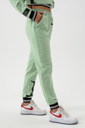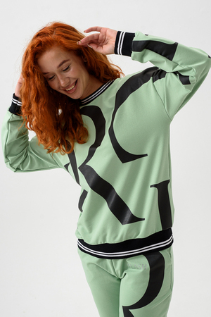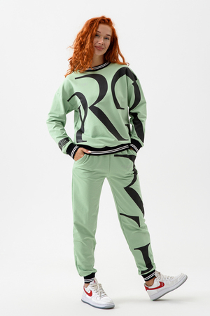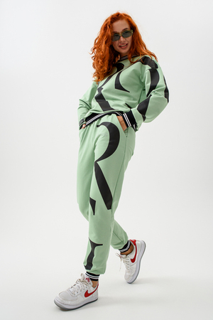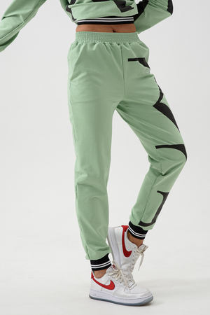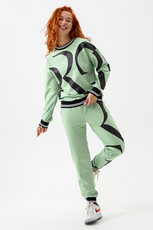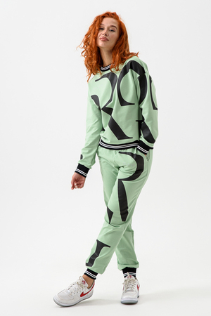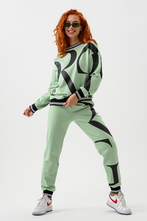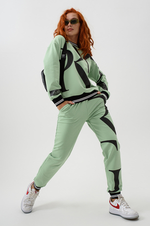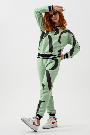Женский костюм с брюками и толстовкой. Материал футер 2-х нитка с лайкрой. По все длине брюк и толстовки печать. Толстовка с манжетами, по низу брюк резинка.