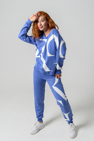 Женский костюм с брюками и толстовкой. Материал футер 2-х нитка с лайкрой. По все длине брюк и толстовки печать. Толстовка с манжетами, по низу брюк резинка.
