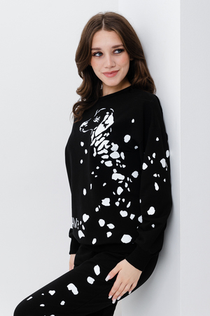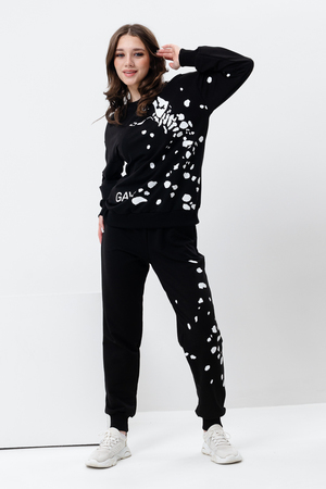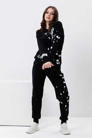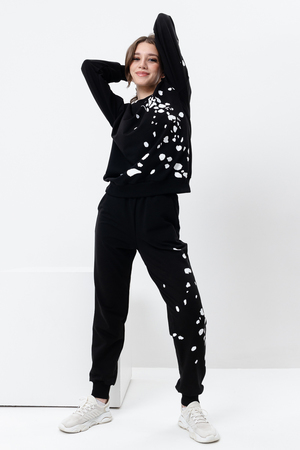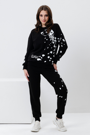 Женский костюм с брюками и толстовкой. Материал футер 2-х нитка с лайкрой. По все длине брюк и толстовки печать. Толстовка с манжетами, по низу брюк резинка.
