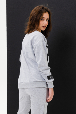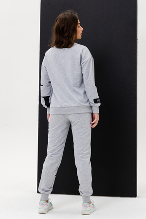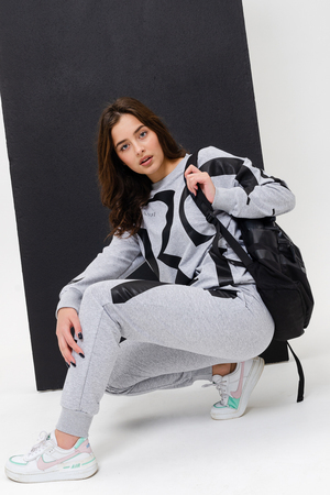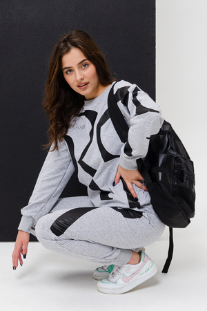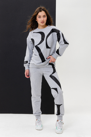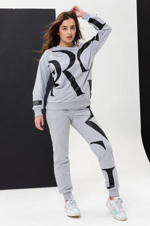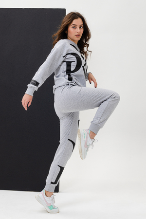 Женский костюм с брюками и толстовкой. Материал футер 2-х нитка с лайкрой. По все длине брюк и толстовки печать. Толстовка с манжетами, по низу брюк резинка.