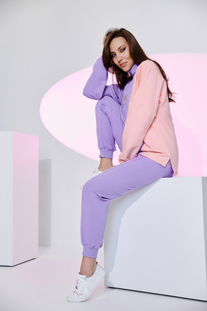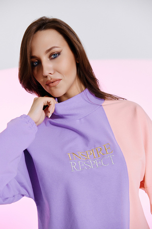 Свитшот женский, модель свободная из контрастных тканей, прямого силуэта. Горловина выполнена из кашкорсе. Рукав со спущенной проймой, манжета на резинке.