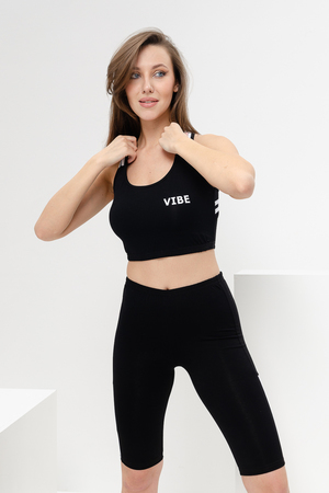 Комплект состоит из топа и велосипедок. Топ на широких бретелях, с округлой горловиной на полочке. В верхней части спинки расположены перекрещенные бретели с отделочными лампасами. Горловина, проймы и бретели обработаны бейкой из основного полотна. Велосипедки облегающие, длинной выше колена, сверху на резинке. Вдоль боковых швов расположены вставки с отделочными лампасы.