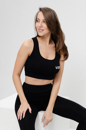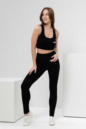 Комплект состоит из топа и леггинсов. Топ на узких бретелях, с округлой горловиной на полочке и вырезом "борцовка" сзади. В верхней части спинки расположена фигурная кокетка с отделочными лампасами и декоративным вырезом. Горловина, проймы и вырез на спинке обработаны бейкой из основного полотна. Леггинсы облегающие, длинные, с завышенным уровнем талии, сверху на широком эластичном поясе. В верхней части боковых швов расположены вставки.