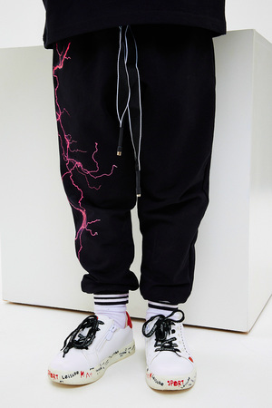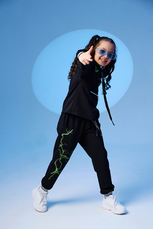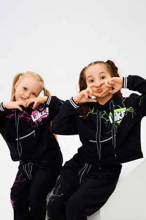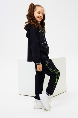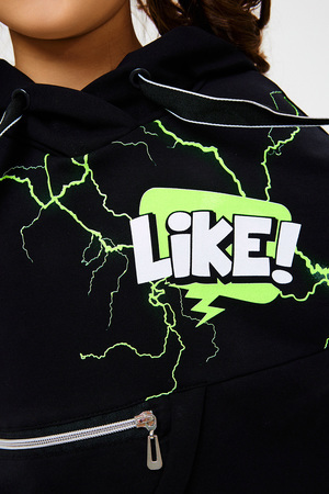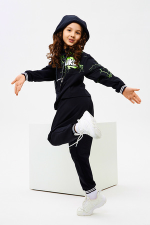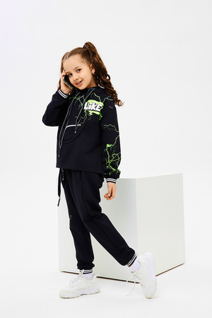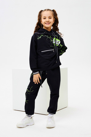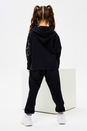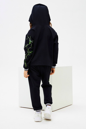 Стильный детский костюм свободного силуэта состоит из худи и брюк оформлен ярким принтом.