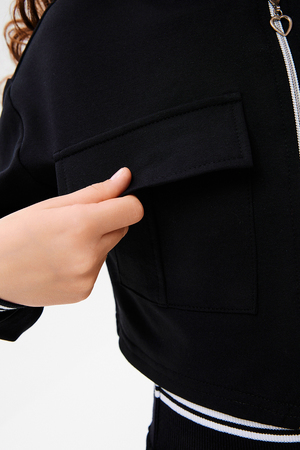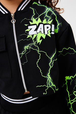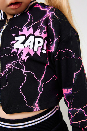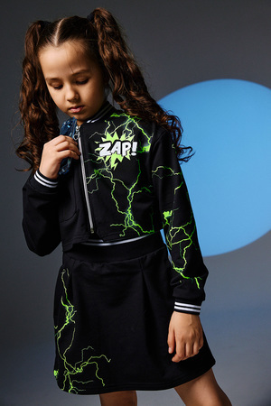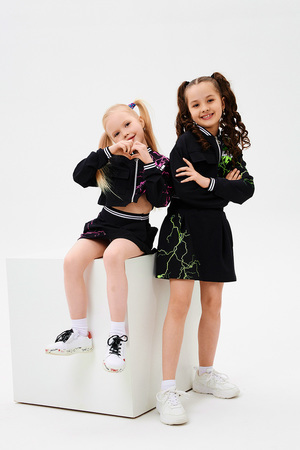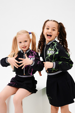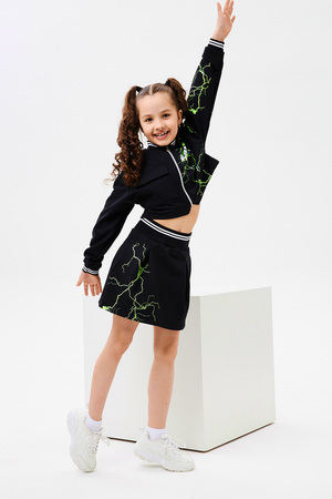 Стильный детский костюм состоит из бомбера и юбки с ярким принтом.