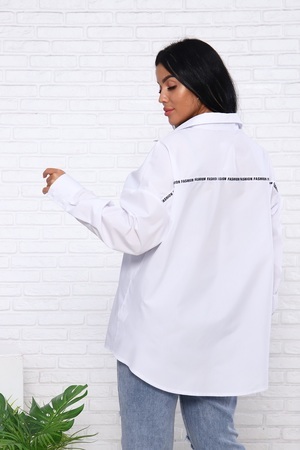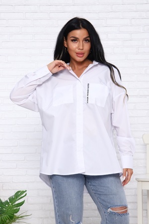Рубашка женская оверсайз на пуговицах, с воротником, рукав длинный с манжетом, низ рубашки закругленный (спинка на 2 см длиннее полочки), 2 кармана на груди, на левом кармане и на кокетке на спине нашита отделочная репсовая лента с печатью (внимание! Утюжить с изнанки). Длина рукава измерена от плечевого шва.