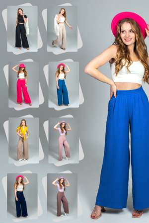 Шикарные женские брюки палаццо с высокой посадкой на эластичном поясе - резинке. Брюки выполнены из ткани с эффектом крэш (жатка). Материал не мнется, очень приятный на ощупь, не деформируется при носке и не просвечивает. Идеально подойдут и для летнего дня в офисе, и для пляжа и даже для вечернего выхода. Для максимального комфорта рекомендуем обработать брюки антистатиком. На брюках тугая резинка, лучше брать на размер больше