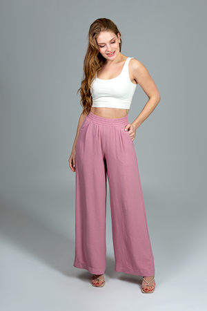 Шикарные женские брюки палаццо с высокой посадкой на эластичном поясе - резинке. Брюки выполнены из ткани с эффектом крэш (жатка). Материал не мнется, очень приятный на ощупь, не деформируется при носке и не просвечивает. Идеально подойдут и для летнего дня в офисе, и для пляжа и даже для вечернего выхода. Для максимального комфорта рекомендуем обработать брюки антистатиком. На брюках тугая резинка, лучше брать на размер больше