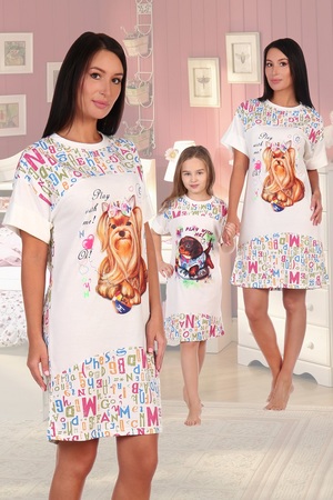 Светлая туника из кулирки. Спереди большой принт в виде собачки с бантом, узор — разноцветные латинские буквы. Рукава короткие, длина чуть выше коленей.