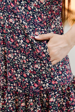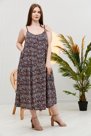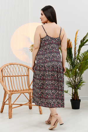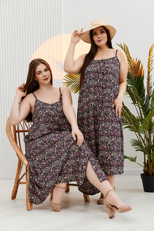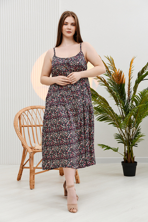 Сарафан женский, расклешенный к низу за счет сборки по линии бедер нижней части полочки и спинки. Спереди планка, застежка на петли - пуговицы. Бретели двойные. В боковых швах внутренние карманы. В лекалах учтена незначительная усадка ткани после стирки.