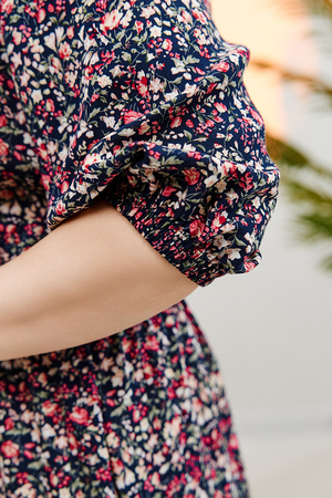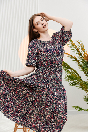 Платье женское приталенного силуэта. Рукав реглан до локтя. Горловина, низ рукава и талия собраны на эластичную тесьму. Нижняя часть платья, расположенная от линии бедер, имеет небольшую сборку. В боковых швах внутренние карманы. В лекалах учтена незначительная усадка ткани после стирки.