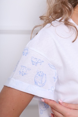 Пижама женская хлопковая с милым принтом "Кот": бриджи и футболка со спущенным плечом, рукав короткий. Кулирка, хлопок 100% - обеспечит максимальный комфорт во время сна.