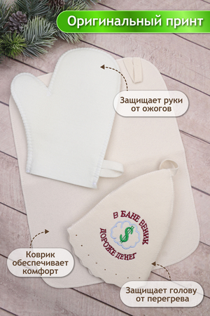 Наш оригинальный набор для бани включает в себя шапку, рукавицу и коврик. Это незаменимые аксессуары для любителей попариться в бане и сауне. Шапка защитит волосы от сухости и ломкости, голову от перегрева и предотвратит появление головокружения. Рукавицы – это повышение комфорта при использовании банного веника и безопасность ваших рук от появления ожогов. А индивидуальный коврик защитит от высоких температур при контакте с горячей лавкой в парилке. Оригинальная вышивка выполнена качественно и не сотрётся в процессе использования. На изделиях имеются петельки, с помощью которых их можно повесить на крючок в предбаннике. Такой набор станет отличным подарком для любителей отдыха в бане или сауне.