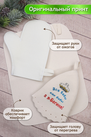 Наш оригинальный набор для бани включает в себя шапку, рукавицу и коврик. Это незаменимые аксессуары для любителей попариться в бане и сауне. Шапка защитит волосы от сухости и ломкости, голову от перегрева и предотвратит появление головокружения. Рукавицы – это повышение комфорта при использовании банного веника и безопасность ваших рук от появления ожогов. А индивидуальный коврик защитит от высоких температур при контакте с горячей лавкой в парилке. Оригинальная вышивка выполнена качественно и не сотрётся в процессе использования. На изделиях имеются петельки, с помощью которых их можно повесить на крючок в предбаннике. Такой набор станет отличным подарком для любителей отдыха в бане или сауне.