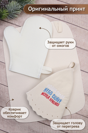 Наш оригинальный набор для бани включает в себя шапку, рукавицу и коврик. Это незаменимые аксессуары для любителей попариться в бане и сауне. Шапка защитит волосы от сухости и ломкости, голову от перегрева и предотвратит появление головокружения. Рукавицы – это повышение комфорта при использовании банного веника и безопасность ваших рук от появления ожогов. А индивидуальный коврик защитит от высоких температур при контакте с горячей лавкой в парилке. Оригинальная вышивка выполнена качественно и не сотрётся в процессе использования. На изделиях имеются петельки, с помощью которых их можно повесить на крючок в предбаннике. Такой набор станет отличным подарком для любителей отдыха в бане или сауне.