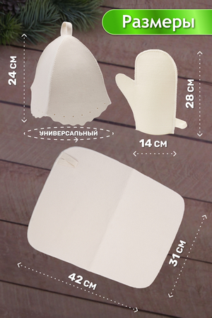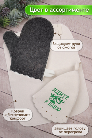 Наш оригинальный набор для бани включает в себя шапку, рукавицу и коврик. Это незаменимые аксессуары для любителей попариться в бане и сауне. Шапка защитит волосы от сухости и ломкости, голову от перегрева и предотвратит появление головокружения. Рукавицы – это повышение комфорта при использовании банного веника и безопасность ваших рук от появления ожогов. А индивидуальный коврик защитит от высоких температур при контакте с горячей лавкой в парилке. Оригинальная вышивка выполнена качественно и не сотрётся в процессе использования. На изделиях имеются петельки, с помощью которых их можно повесить на крючок в предбаннике. Такой набор станет отличным подарком для любителей отдыха в бане или сауне.