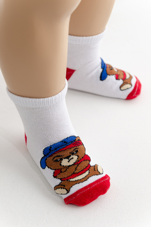 Набор детских носочков. Комплект из трех пар, две из которых с изображением мультяшного Мишки, третья пара в полоску.