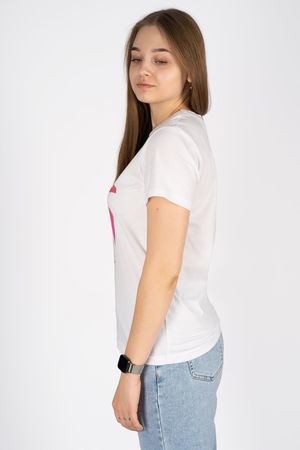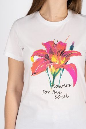 Футболка - это классика современного гардероба любой девушки. Эта базовая белоснежная футболка с ярким принтом в виде цветка смотрится круто с джинсами, юбками и брюками любых цветов. Прямой силуэт, втачной рукав, горловина круглая, обработана воротником из кулирки, в цвет изделия. Горловина по полочке отстрочена на 0,1 нитками в цвет изделия. Горловина спинки внутри обработана настрочной планкой из кулирки. Низ изделия и рукавов обработан швом вподгибку. На полочке фотопринт с шелкографией.
