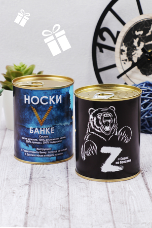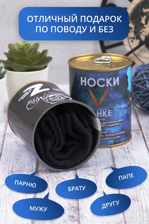 Носки в консервной банке - отличное решение для подарка мужчине на любой случай. Внутри банки носки мужские 1 пара, состав 80% хлопок, 15% полиамид, 5% лайкра, универсального размера 41-46. Использование высококачественного материала позволяет коже "дышать", а добавление небольшого количества синтетических нитей делает носки долговечней.