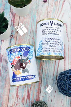 Носки в консервной банке - отличное решение для подарка мужчине на любой случай. Внутри банки носки мужские 1 пара, состав 80% хлопок, 15% полиамид, 5% лайкра, универсального размера 41-46. Использование высококачественного материала позволяет коже "дышать", а добавление небольшого количества синтетических нитей делает носки долговечней.