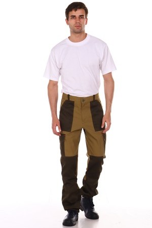Брюки с цельнокроеным поясом, застегиваются на петлю и пуговицу. На верхних частях передних половинок расположены верхние накладные карманы и нижние накладные карманы с фигурными клапанами на пуговицах. Нижние карманы с объемом с одной стороны и переходят на задние половинки.
