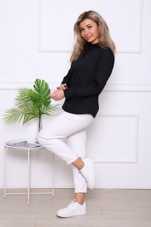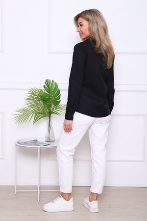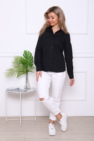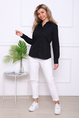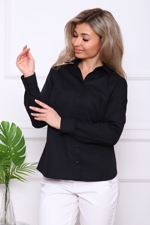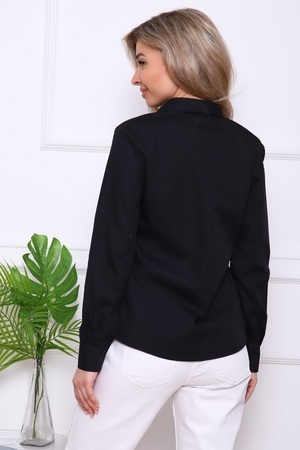 Туника-рубашка женская классическая чёрная, с длинными рукавами, закругленный низ полочки и спинки. Нагрудные вытачки и лёгкая приталенность обеспечивают оптимальную посадку и модный силуэт. Черный цвет выглядит дорого, элегантно, всем идёт и легко комбинируется с любыми вещами в гардеробе.
