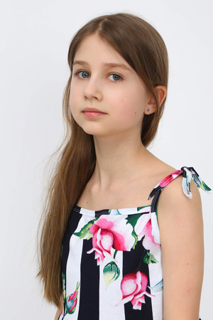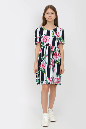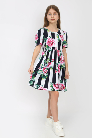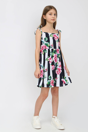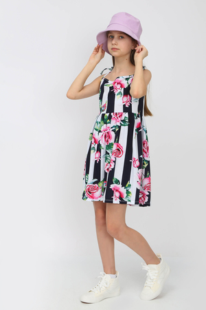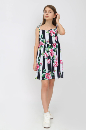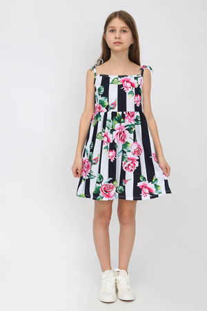 Сарафан отрезной расклешенный, приталенный силуэт, открытый, без рукава на бретельках-завязках. Удобно фиксировать длину бретели. Цвет белый в черную полосу с розами. Можно носить на белую футболку, г. Нарядный, подходит для праздников, повседневной носки, платье в детский садик, на пляж