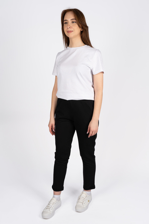 Укороченные женские брюки - стильный и современный вариант для тех, кто следит за модными новинками. Крой - отрезной пояс из основного полотна. На передней половинке брюк карманы с отрезным бочком, вход в карман обработан строчкой. Низ изделия с отворотом петлей наружу закреплен отстрочкой по верхнему срезу. На левом кармане вшивной элемент, закрепленный отстрочкой. Брюки идеально подходят как для повседневных образов, для дома, занятий в спортзале и активного отдыха. Модные тенденции допускают их использование не только на тренировках, но и для прогулок, шоппинга и прочих неформальных мероприятий. Особенность этих брюк в том, что они могут сочетаться с разнообразными вещами и вполне себе впишутся в ваш ежедневный гардероб. С помощью штанов можно создавать огромное количество композиций и выглядеть очень стильно весной, летом и осенью.