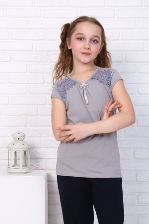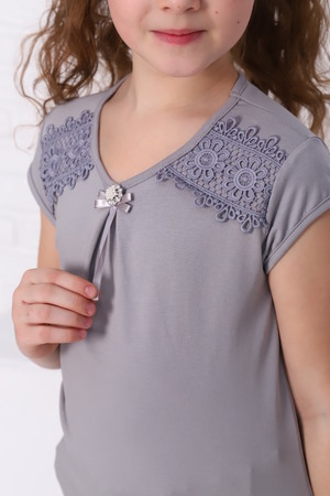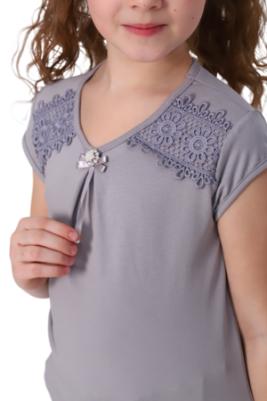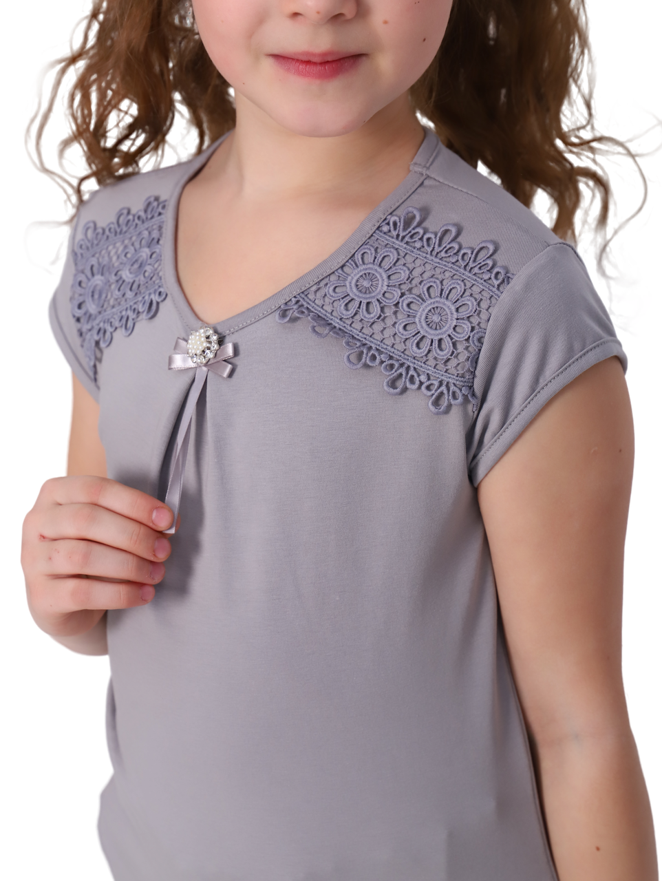 Базовая школьная блузка для девочек с коротким рукавом. Нарядная блузка станет основой как повседневного, так и праздничного образа. Мягкое кружево придает модели нежности. Спереди прикреплен съемный декоративный элемент из атласных лент и броши. Модель составит одинаково удачный комплект и с юбкой, и с брюками. Блузка сшита из качественного трикотажа, используемый материал не теряет форму после многократных стирок, мягкий и приятный к телу, устойчив к износу. Для сохранения первоначальных свойств изделия, важно соблюдать рекомендации по уходу.