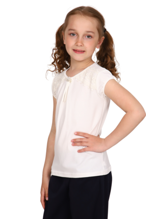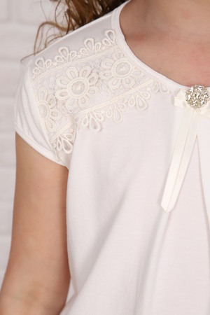 Базовая школьная блузка для девочек с коротким рукавом. Нарядная блузка станет основой как повседневного, так и праздничного образа. Мягкое кружево придает модели нежности. Спереди прикреплен съемный декоративный элемент из атласных лент и броши. Модель составит одинаково удачный комплект и с юбкой, и с брюками. Блузка сшита из качественного трикотажа, используемый материал не теряет форму после многократных стирок, мягкий и приятный к телу, устойчив к износу. Для сохранения первоначальных свойств изделия, важно соблюдать рекомендации по уходу.