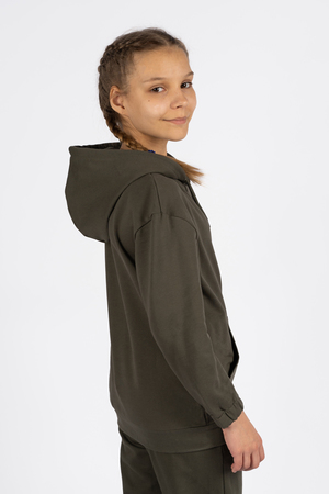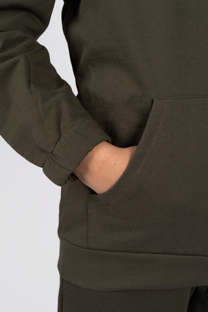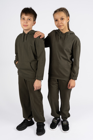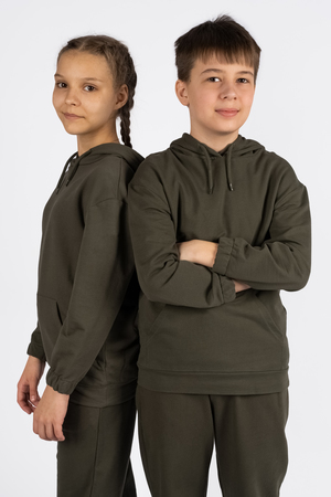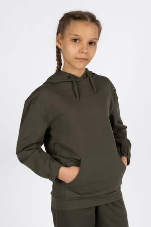 Мягкий хлопковый джемпер - универсальная вещь в гардеробе каждого ребенка. Отлично садится по фигуре и не теряет цвет после многочисленных стирок. Толстовка прямого силуэта со спущенным длинным рукавом. Горловина круглая с капюшоном. Капюшон состоит из 2 половин. Горловина спинки внутри обработана настрочной планкой из киперной ленты. С изнанки капюшона выполнен подклад из кулирки. По переднему срезу капюшона для утяжки вставлен утягивающий круглый канатный шнурок. Для выхода шнурка предусмотрены пробивные петли. Рукав заканчивается манжетой из основного полотна. По низу изделия пояс из основного полотна. На полочке расположен карман кенгуру.