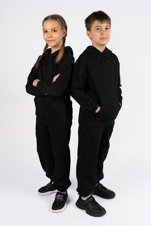 Мягкий хлопковый джемпер - универсальная вещь в гардеробе каждого ребенка. Отлично садится по фигуре и не теряет цвет после многочисленных стирок. Толстовка прямого силуэта со спущенным длинным рукавом. Горловина круглая с капюшоном. Капюшон состоит из 2 половин. Горловина спинки внутри обработана настрочной планкой из киперной ленты. С изнанки капюшона выполнен подклад из кулирки. По переднему срезу капюшона для утяжки вставлен утягивающий круглый канатный шнурок. Для выхода шнурка предусмотрены пробивные петли. Рукав заканчивается манжетой из основного полотна. По низу изделия пояс из основного полотна. На полочке расположен карман кенгуру.