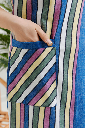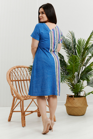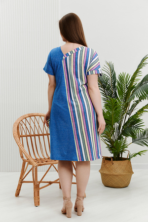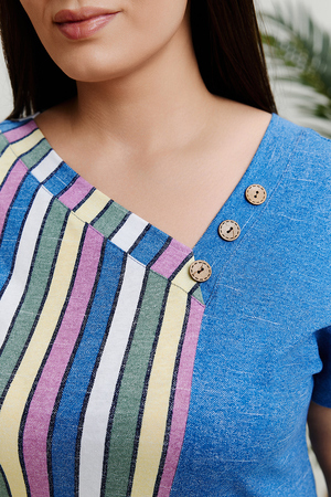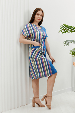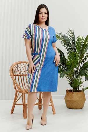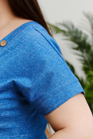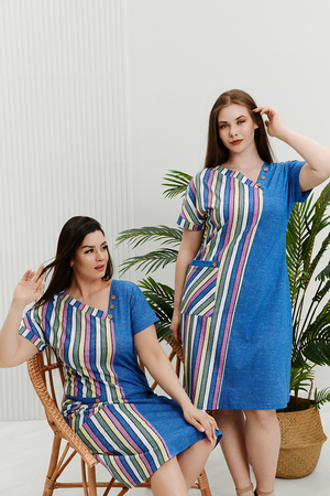 Женское платье с фигурным вырезом горловины, декорировано кокосовыми пуговицами. Сбоку накладной карман.
