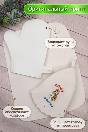 Наш оригинальный набор для бани включает в себя шапку, рукавицу и коврик. Это незаменимые аксессуары для любителей попариться в бане и сауне. Шапка защитит волосы от сухости и ломкости, голову от перегрева и предотвратит появление головокружения. Рукавицы – это повышение комфорта при использовании банного веника и безопасность ваших рук от появления ожогов. А индивидуальный коврик защитит от высоких температур при контакте с горячей лавкой в парилке. Оригинальная вышивка выполнена качественно и не сотрётся в процессе использования. На изделиях имеются петельки, с помощью которых их можно повесить на крючок в предбаннике. Такой набор станет отличным подарком для любителей отдыха в бане или сауне.