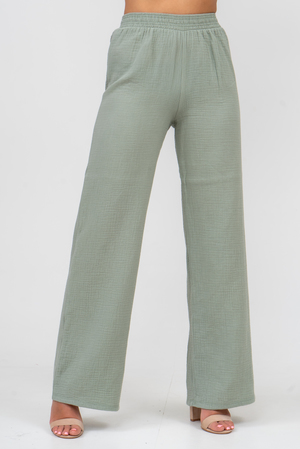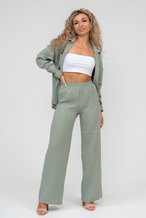 Модные женские брюки - палаццо с завышенной линией талии выполнены из лёгкого струящегося двухслойного муслина. Пояс брюк обработан на специализированной поясной машине. Кажется в новом сезоне с фантастическим муслином познакомился каждый! Воздушный, невесомый, с присущей ему особенной жатой фактурой - это очевидный мастхев летних коллекций, который с успехом переходит в другие сезоны в виде предметов домашнего гардероба. Такая находка и раньше была известна всем, но в этом сезоне тренд с муслином захватил буквально всех. Изделие из такого материала имеет огромное количество плюсов: это 100% хлопок без добавок, брюки из такого материала безупречны для жары, натуральная дышащая структура, лёгкие, практически не ощущаются на теле, и быстро сохнут при намокании. Именно поэтому необычная и фактурная ткань цепляет взгляды окружающих и прекрасно подходит для прогулок, в отпуск, на праздник или для пляжного отдыха. Стирать муслиновые вещи нужно только в тёплой воде при температуре не выше 40° С. Брюки такого плана - это отличный подарок самой себе, и твоё лучшее решение!