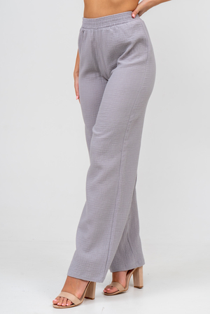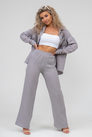Модные женские брюки - палаццо с завышенной линией талии выполнены из лёгкого струящегося двухслойного муслина. Пояс брюк обработан на специализированной поясной машине. Кажется в новом сезоне с фантастическим муслином познакомился каждый! Воздушный, невесомый, с присущей ему особенной жатой фактурой - это очевидный мастхев летних коллекций, который с успехом переходит в другие сезоны в виде предметов домашнего гардероба. Такая находка и раньше была известна всем, но в этом сезоне тренд с муслином захватил буквально всех. Изделие из такого материала имеет огромное количество плюсов: это 100% хлопок без добавок, брюки из такого материала безупречны для жары, натуральная дышащая структура, лёгкие, практически не ощущаются на теле, и быстро сохнут при намокании. Именно поэтому необычная и фактурная ткань цепляет взгляды окружающих и прекрасно подходит для прогулок, в отпуск, на праздник или для пляжного отдыха. Стирать муслиновые вещи нужно только в тёплой воде при температуре не выше 40° С. Брюки такого плана - это отличный подарок самой себе, и твоё лучшее решение!