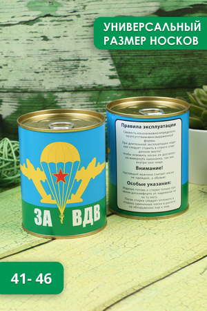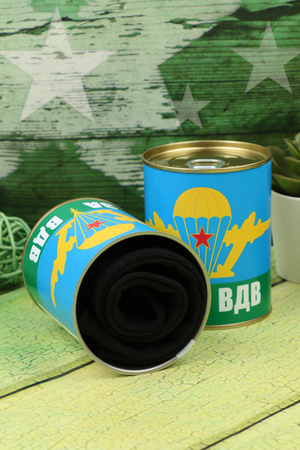 Носки в консервной банке - отличное решение для подарка мужчине на любой случай. Внутри банки носки мужские 1 пара, состав 80% хлопок, 15% полиамид, 5% лайкра, универсального размера 41-46. Использование высококачественного материала позволяет коже "дышать", а добавление небольшого количества синтетических нитей делает носки долговечней. Носки в консервной банке с принтом "За ВДВ"