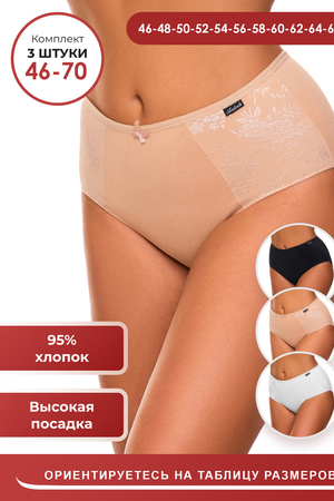 У трусов большой размерный ряд 46-48 до 70-72 и каждая женщина может подобрать себе нижнее белье по размеру. Трусы позволят сделать вашу фигуру более подтянутой, а так же украсят ваш образ в брюках и платье. Именно поэтому для более плотной посадки рекомендуем брать на размер меньше. Модель не видна под одеждой. Мы позаботились о вас и представили корректирующее белье в наборах, которые очень приятны к коже благодаря натуральному хлопку 95% и эластану 5% в составе. Трусики представлены в разнообразных цветовых наборах по три штуки, которые подойдут каждой по вкусу. Поможем подобрать комплект трусов слипов именно под Вас. Рекомендуем деликатную машинную стирку при 30 градусах.