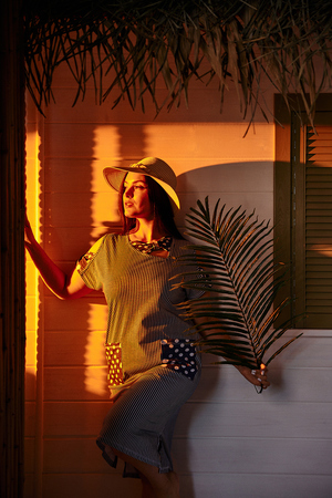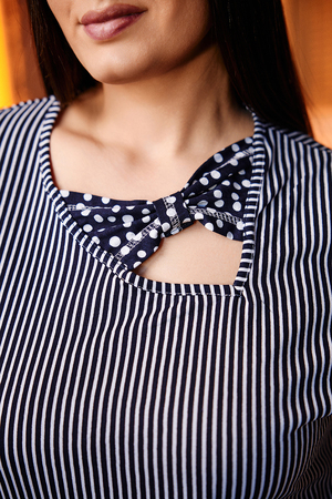 Платье женское полуприлегающего силуэта. Горловина асимметричная, рукав как таковой отсутствует за счет разрезов вдоль плеча, на полочке два накладных кармана. В боковых швах разрезы. Бантики в горловине и разрезах рукавов придают платью особую женственность.