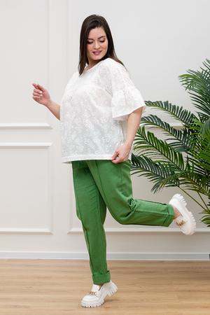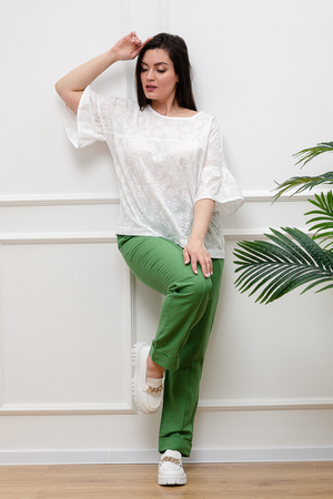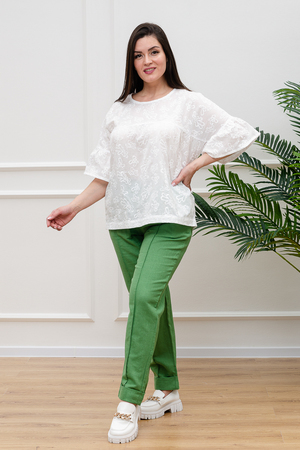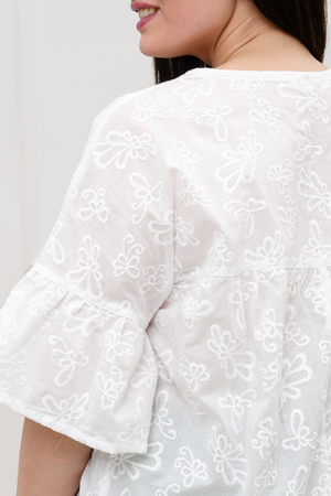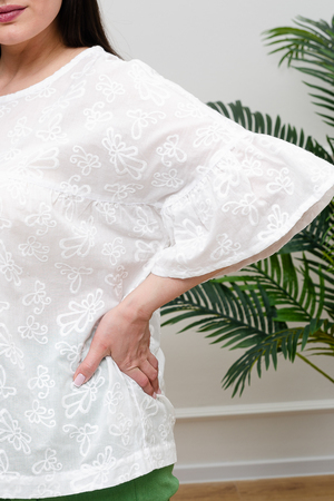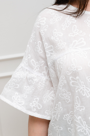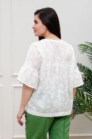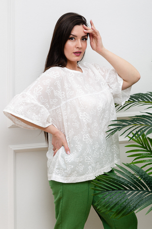 Нежная белая блузка из хлопкового шитья будет приковывать к вам восхищенные взгляды. Изысканная вышивка будет смотреться женственно и романтично. Рукава длиной 3/4 подчеркнут изящество фигуры, а просторный крой гарантирует комфорт даже в самую жаркую погоду. В составе только натуральный хлопок - дышащий и гипоаллергенный.
